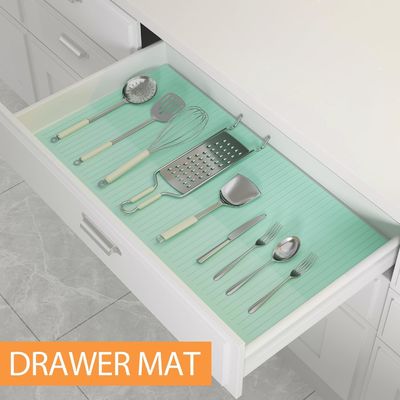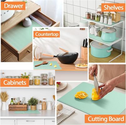 Каждый лайнер мягкий, гибкий и его легко нарезать в разные размеры, что делает их идеальным для различных мест, включая полки холодильника, ящики для овощей, шкафы и кухонные столешницы. Не скользящая текстура гарантирует, что она остается на месте даже с более тяжелыми банками и контейнерами сверху.